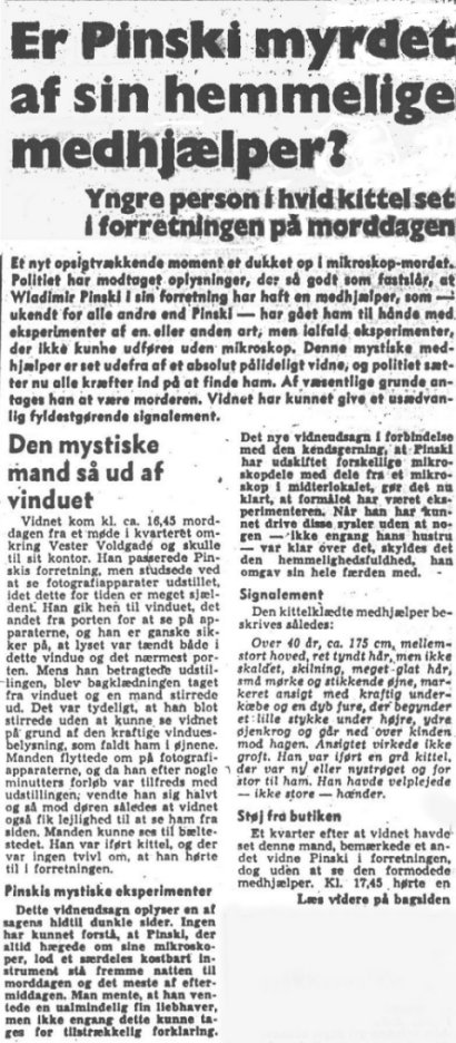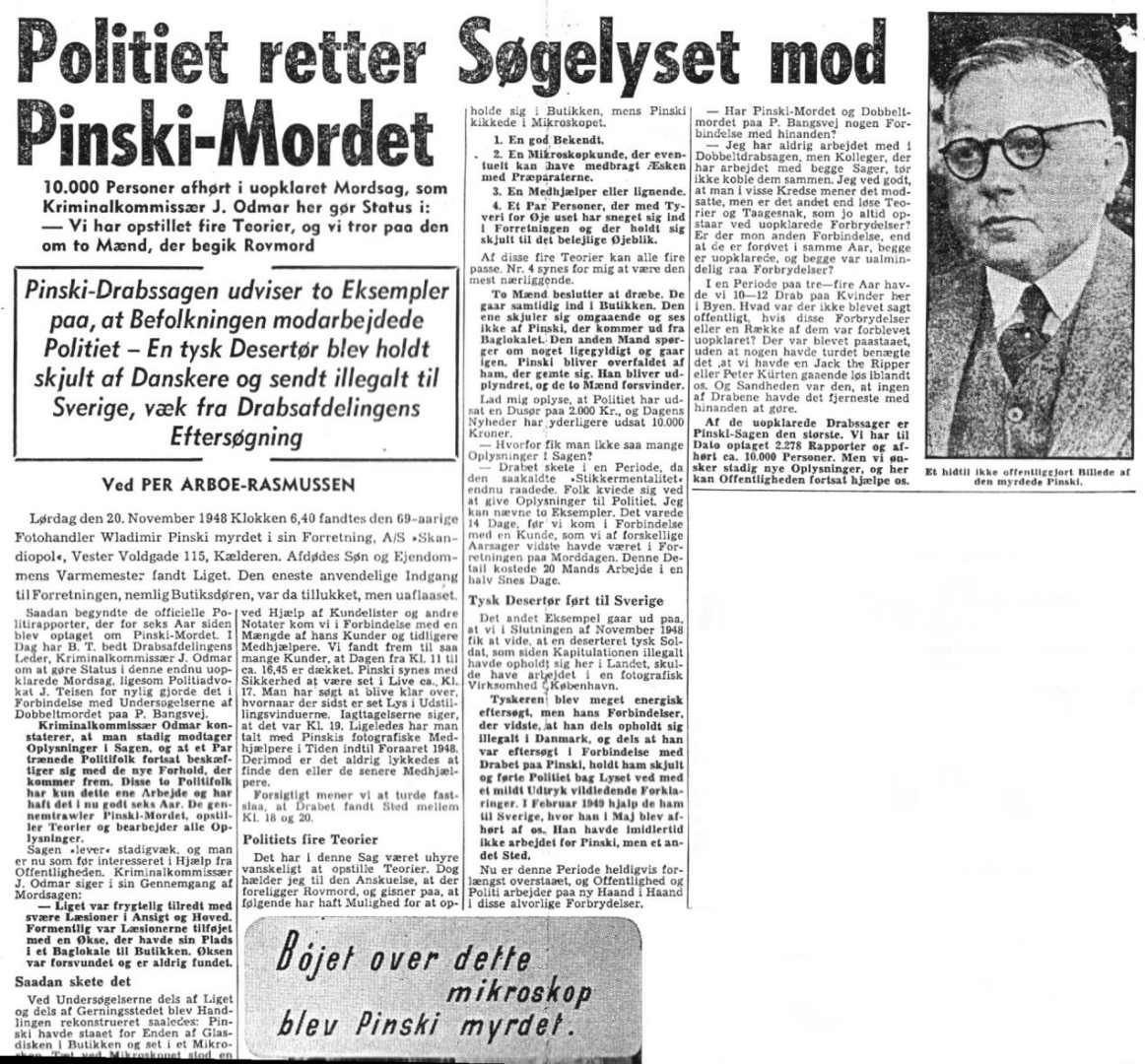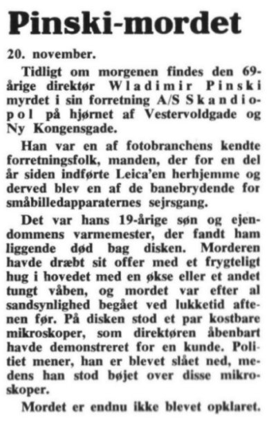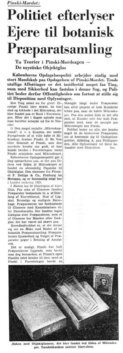 Bl.a. nævner forfatteren at en mand med interesse for mikroskoper bliver afhørt af politiet. Inden man kan afhøre ham igen begår han selvmord (3. december 1948 på Østerbro) efter også, at have givet sin hustru cyankalium.